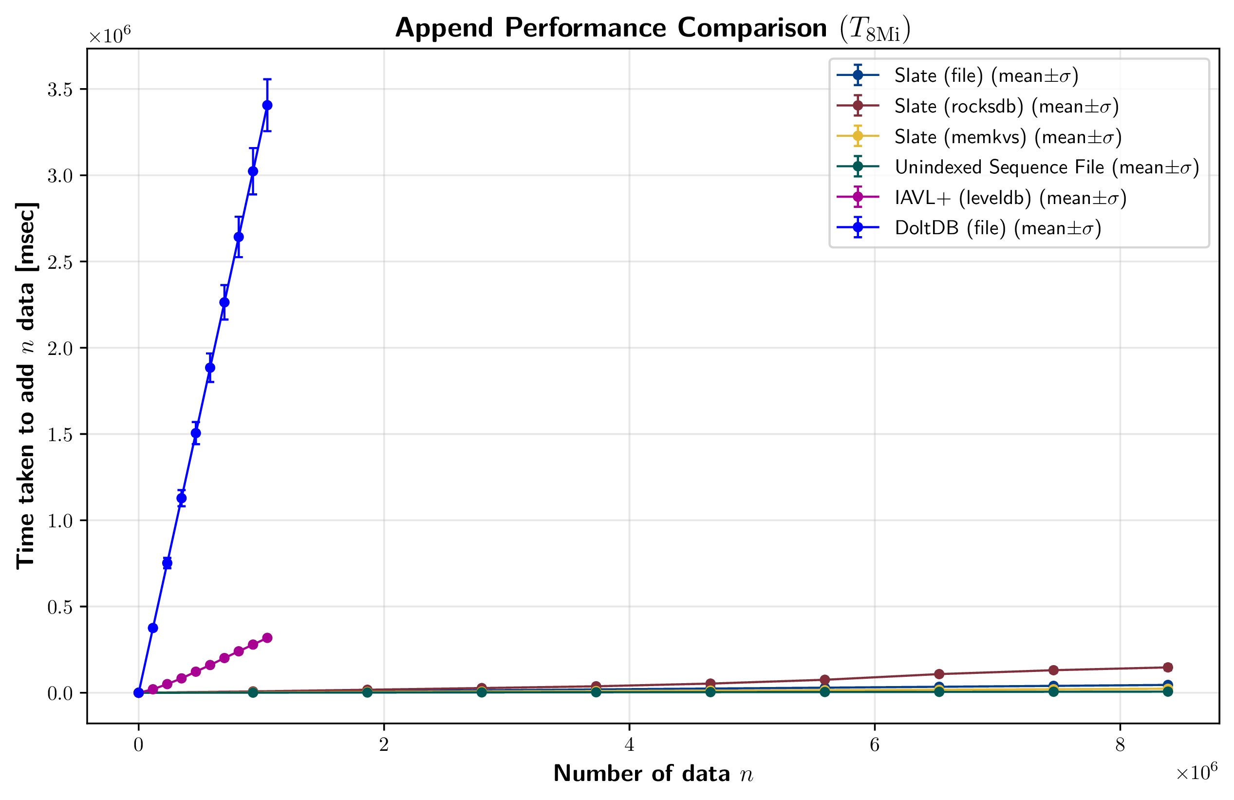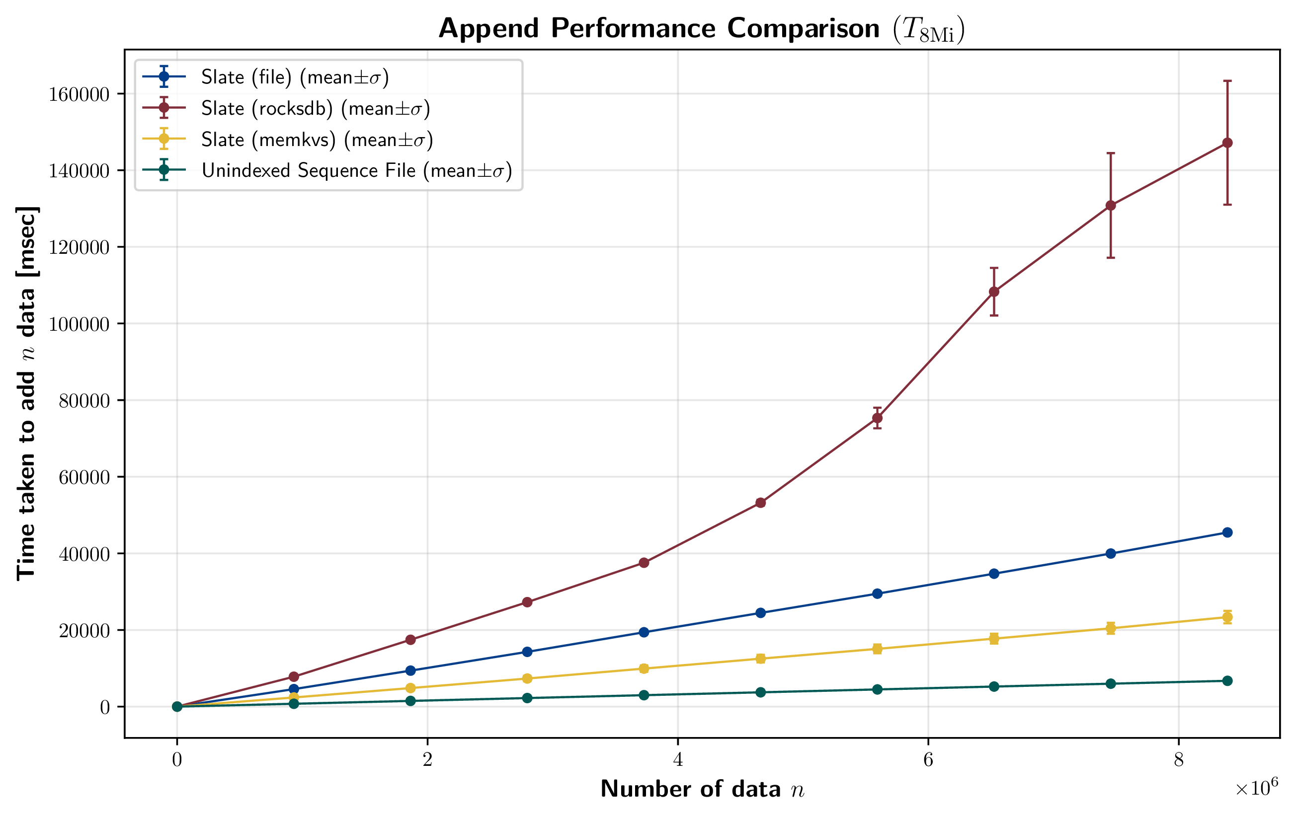 またこの結果は、ストレージ層に RocksDB を使用する Slate (rocksdb) 実装は全体的に Slate (file) より遅いことを示している。これは、RocksDB の LSM-Tree 構造における書き込みコストが単純なシーケンシャルファイルに比べて大きいためと考えられる。興味深いことに、\(n=4{\rm Mi}\) エントリあたりまでは直線的に推移したあと、1 回の append にかかる時間が徐々に増加している。