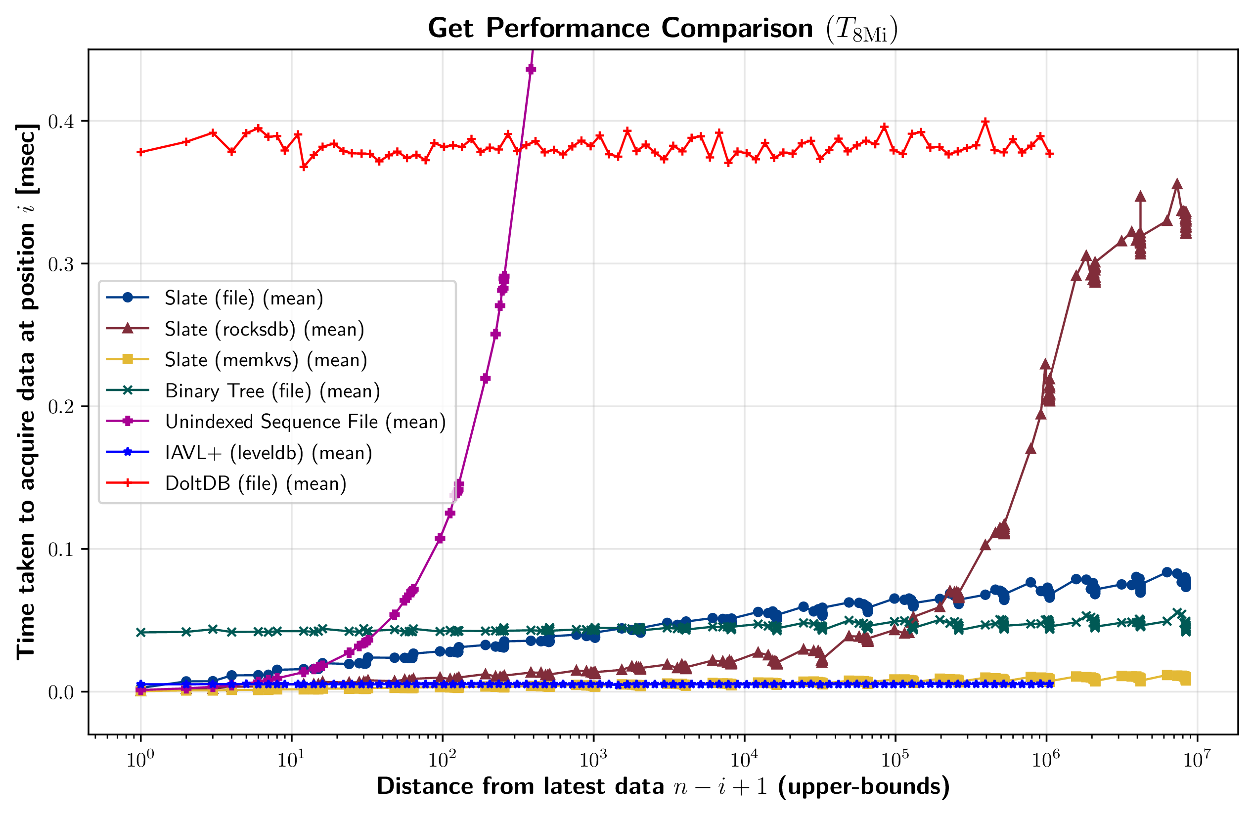 Slate (rocksdb) の計測結果は、最新データに近い位置で Slate (file) よりも良いが、遠い位置になると get 時間が対数の傾向を超えて大幅に増加する。これは、RocksDB の LSM-Tree 構造においてレベルが深くなると、単純なシーケンシャルファイルに比べて読み込みコストが大きくなるためと考えられる。