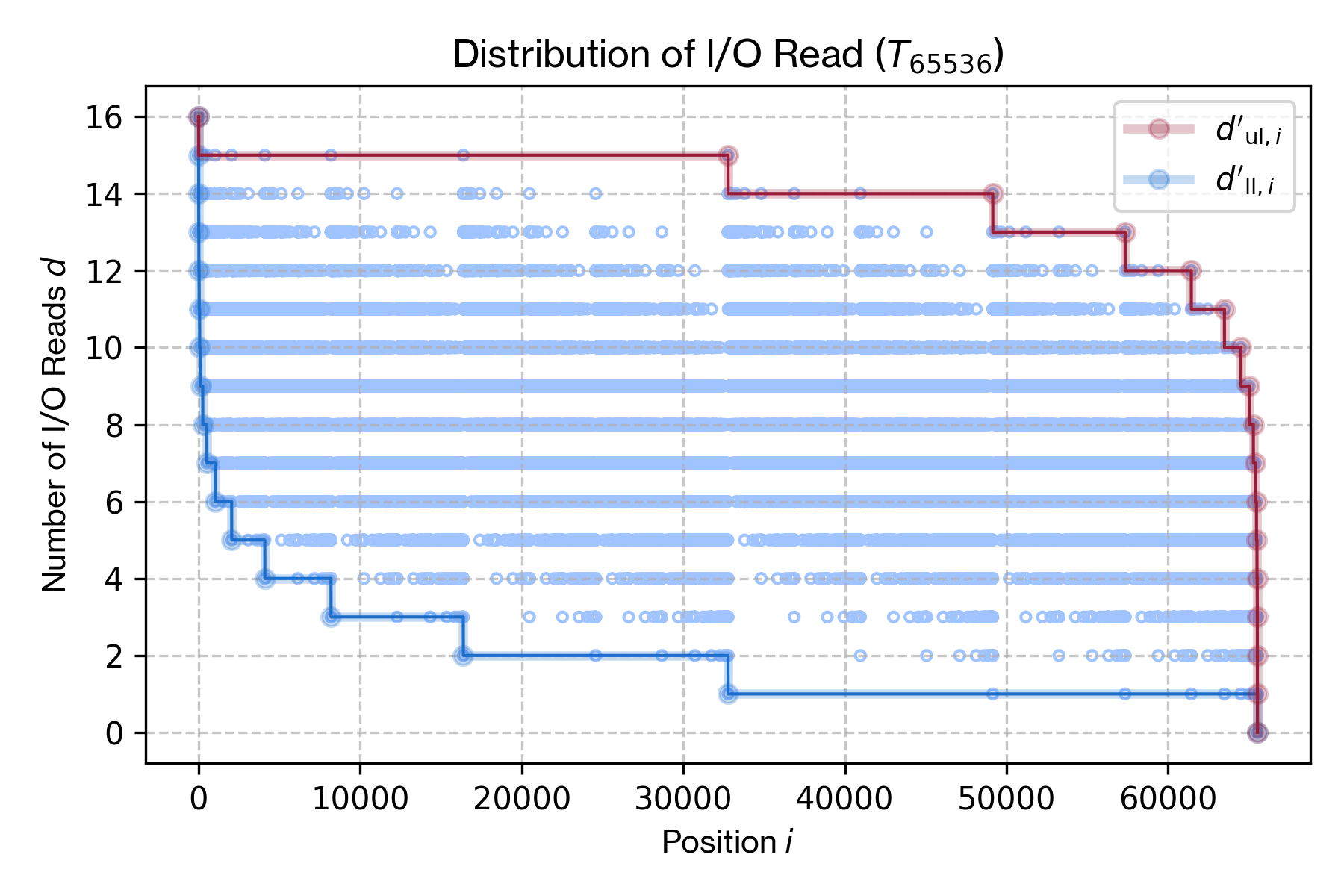分岐の検出性能は、ある位置 \(i\) のデータのみが異なる Slate (file) を 2 つ用意し、認証パスを用いてその位置を特定するまでの時間を計測する。ここでそれぞれの Slate には \(n = 8{\rm Gi}\) 個のエントリが保存されており、差異の位置 \(i\) は I/O 回数の理論的上限となる、式 (\(\ref{io_read_worst}\)) の \(d'_u\) に基づく 277 個の位置を選択した。