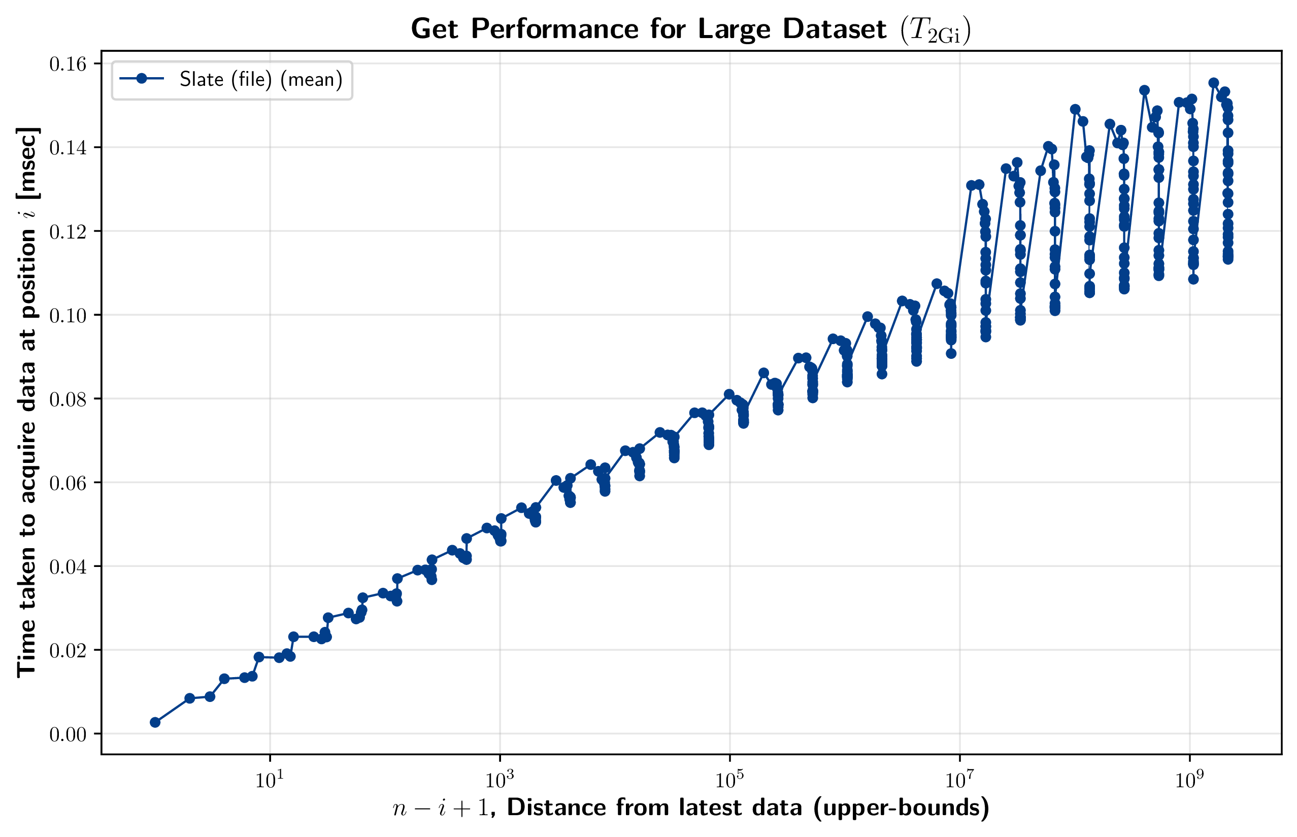 Slate (file) の計測結果では、get コストが最新データに近い位置 (グラフ左側) から遠い位置 (グラフ右側) に向けて対数的な増加を示している。これは、get の時間複雑性が最新データからの位置に対する I/O 回数に依存するという予想と一致する。右下のグラフは Slate (file) のデータ数を \(n=2{\rm Gi}\) に増やしたケースで同様の計測を行った結果である。\(n=8{\rm Mi}\) のケースと同様に対数増加の傾向を示しているが、距離が離れるにつれて振動している。