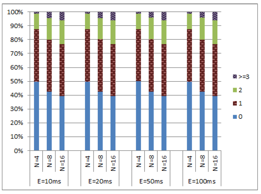 これらのシミュレーションでは、クロックドリフトが \(\epsilon\) を超えない限りノードの物理クロックを 1ms 進めることができる。ノードが物理クロックを進めることを許可されている場合、それを増加させるのは 50% の確率である。クロックを進めるときに一定の確率でメッセージ送信できる (このセクションのすべてのシミュレーションでは、この送信確率を 100% と仮定している)。我々はこのメッセージは最も早い実現可能なタイミングで送信し、実質的に送信時間を 0 とする。その結果は Figure 7 に示す通りである。これらの図が示すように、\(c\) 値の分布は \(\epsilon\) の値に対して比較的独立していた。さらに、99% 以上のイベントで \(c\) 値は 4 以下であり、(c\) 値が 5 から 8 の範囲となるイベントは 1% 未満であった。