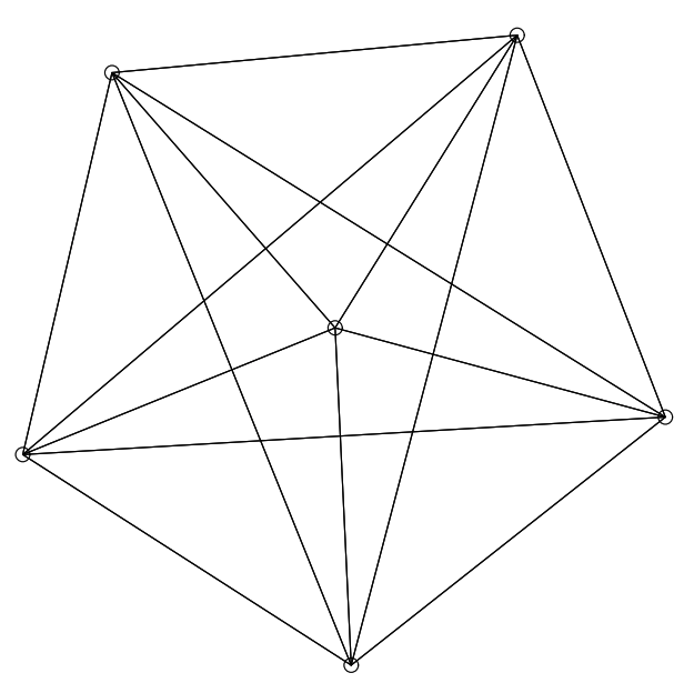 \(K_5\) と他の完全ブラフ \(K_4\) (Figure 11)、\(K_6\) (Figure 12 と Figure 13)、\(K_8\) (Figure 14) は平衡状態における引力と反発力のバランスを示している。\(K_4\) は平面的 (planar; 辺が交差していないグラフ) だがそう表現されていないことに注意。平面表現には歪曲した辺が必要だが、おそらくここで生成される表現ほど人間にとって自然でない。完全グラフは次数が高くなるほど小さくなり、辺の密度が高くなるほど平衡に達する距離が短くなる。頂点間の理想的な距離の計算は、\(K_2\) Figure 15 の単純なケースでのみ理想的に説明したとおりに機能するが、すべての図は拡大フィルターを通しているためすべてほぼ同じサイズとなっている。単純な平面、またはほぼ平面の対称グラフの例では、Figure 16 の 3 つと、最初に Kamada と Kawai [7] で登場した Figure 17、Davidson と Harel [9] で登場した Figure 18 の 1 つが挙げられる。Kamada と Kawai が提示したグラフは特に簡単で、我々のレンダリングは本質的に彼らのものと同じである。