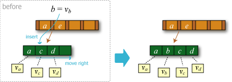 - 葉が既に同じキーを持つエントリを保持していた場合、キーの重複を許すのであればキーに関連付けられたデータを追加し挿入操作を終了 (葉のエントリ数は変化しない)。キーの重複を許さない場合は重複エラーとし挿入操作を終了する。