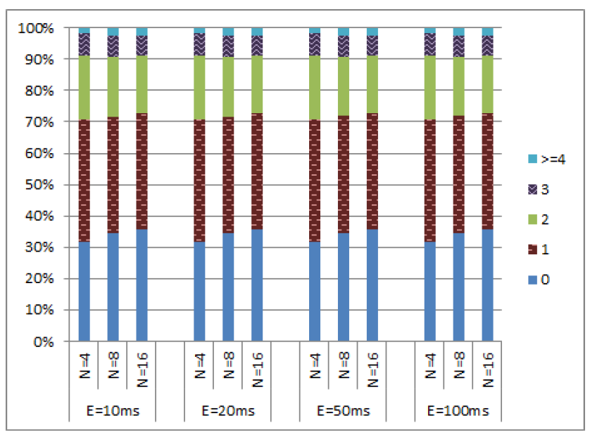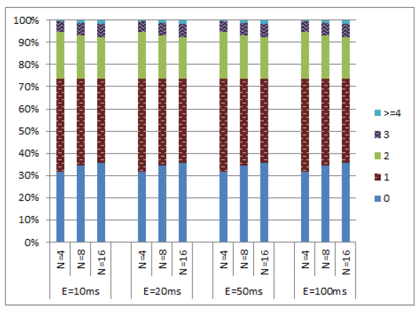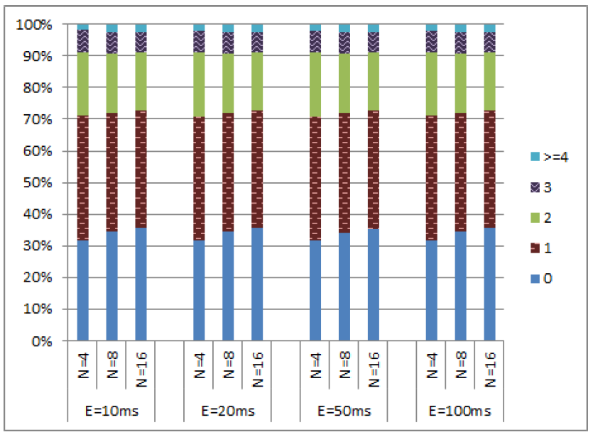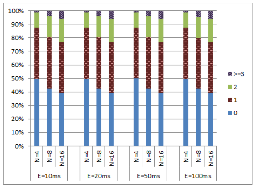 これらのシミュレーションでは、クロックドリフトが \(\epsilon\) を超えない限りノードの物理クロックを 1ms 進めることができる。ノードが物理クロックを進めることを許可されている場合、それを増加させるのは 50% の確率である。クロックを進めるときに一定の確率でメッセージ送信できる (このセクションのすべてのシミュレーションでは、この送信確率を 100% と仮定している)。我々はこのメッセージは最も早い実現可能なタイミングで送信し、実質的に送信時間を 0 とする。その結果は Figure 7 に示す通りである。これらの図が示すように、\(c\) 値の分布は \(\epsilon\) の値に対して比較的独立していた。さらに、99% 以上のイベントで \(c\) 値は 4 以下であり、(c\) 値が 5 から 8 の範囲となるイベントは 1% 未満であった。