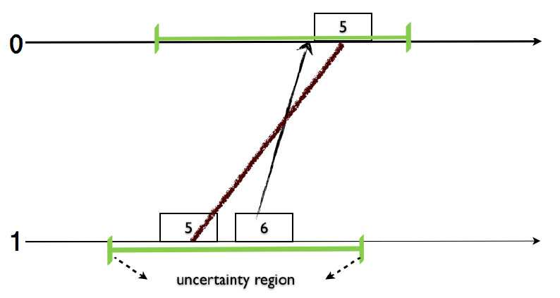 この無制限なクロックドリフト問題の根本原因は、ナイーブアルゴリズムが \(l\) を用いて、これまでに観測された \(pt\) 値の最大値と、新規イベント (ローカルイベント、送信イベント、受信イベント) による論理クロックの増分の両方の情報を保持しようとする点にある。この設計によりクロックは情報を失う。すなわち、新たに設定された \(l\) 値が \(pt\) 値に由来するものか (例えばノード 0 からノード 1 へのメッセージ送信の場合)、あるいは因果関係に由来するものか (その他のメッセージの場合) が不明確になる。このため、\({\sf hb}\) 関係を失うことなく \(l\) 値をリセットして \(l-pt\) の差を制限する適切な方法が存在せず、これは要件 1 の違反につながる可能性がある。