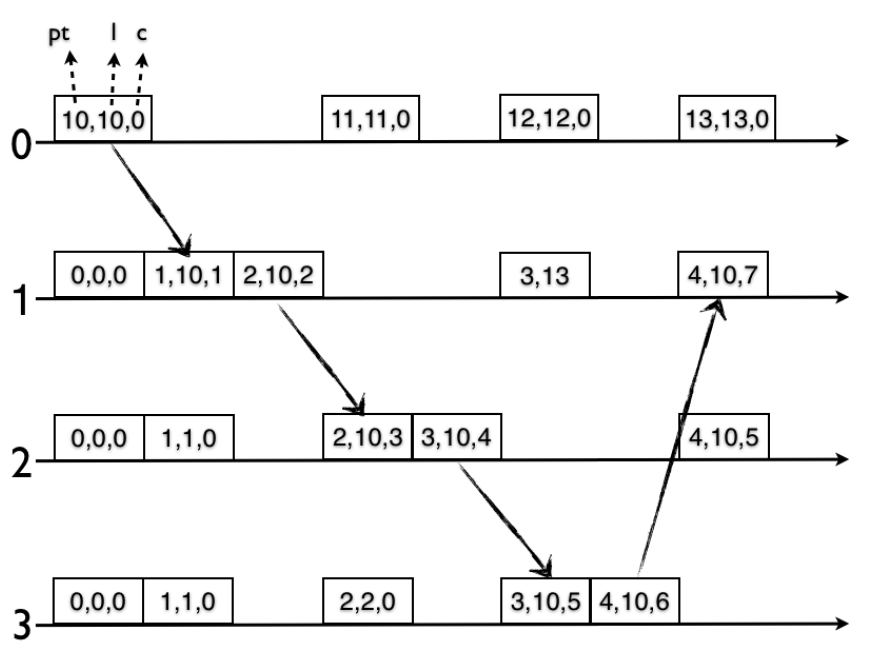 しかし HLC を単一の 64 ビットタイムスタンプとして表現するにはいくつかの課題がある。第一に、HLC アルゴリズムでは \(l\) と \(c\) を別々に維持し、物理クロックの経過時間による増加と、送信/受信/ローカルイベントによる因果関係の更新を区別する。第二に、\(pt\) を追跡することにより \(l\) のサイズはデフォルトで NTP タイムスタンプと同じ 64 ビットである。