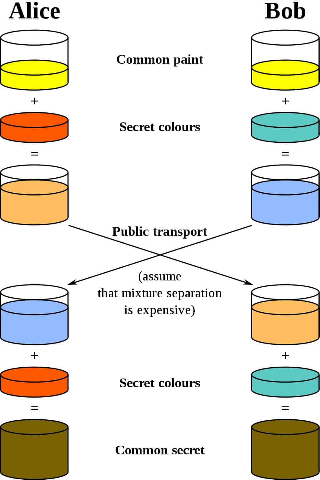 この DH 鍵共有のアルゴリズムはしばしば Fig 2. のようなインクの混ぜ合わせによって双方で共通の色を作る操作で説明されている。